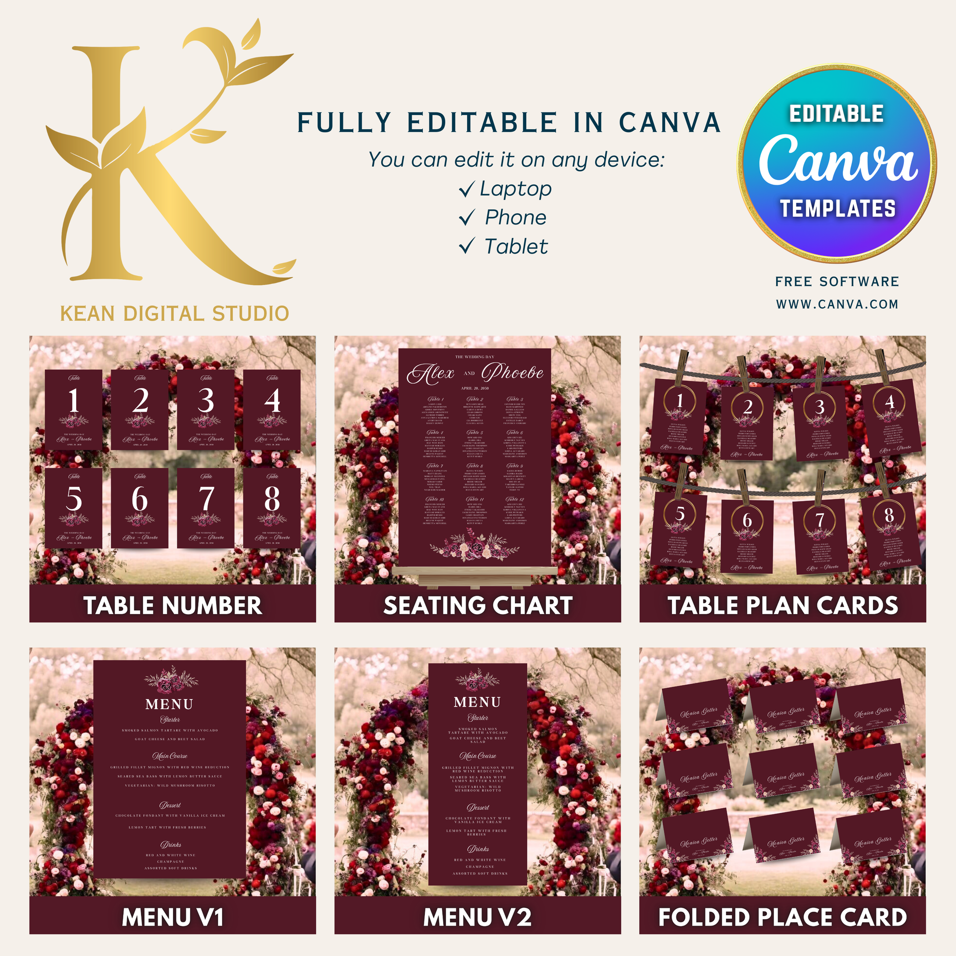 This all-in-one bundle includes invites, signage, menus, programs, seating chart templates, table numbers, and more, all in a rich Mulberry red palette perfect for burgundy, wine, deep red, and gothic romance weddings.