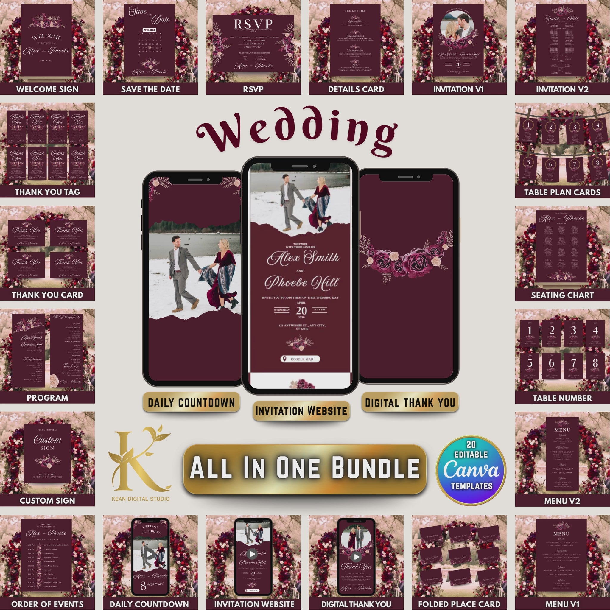 All In One Midnight Mulberry Wedding Templates, Fully Editable Burgundy Red Wedding Invitation plus Website Bundle, Daily Countdown and Digital Thank you, Instant Download